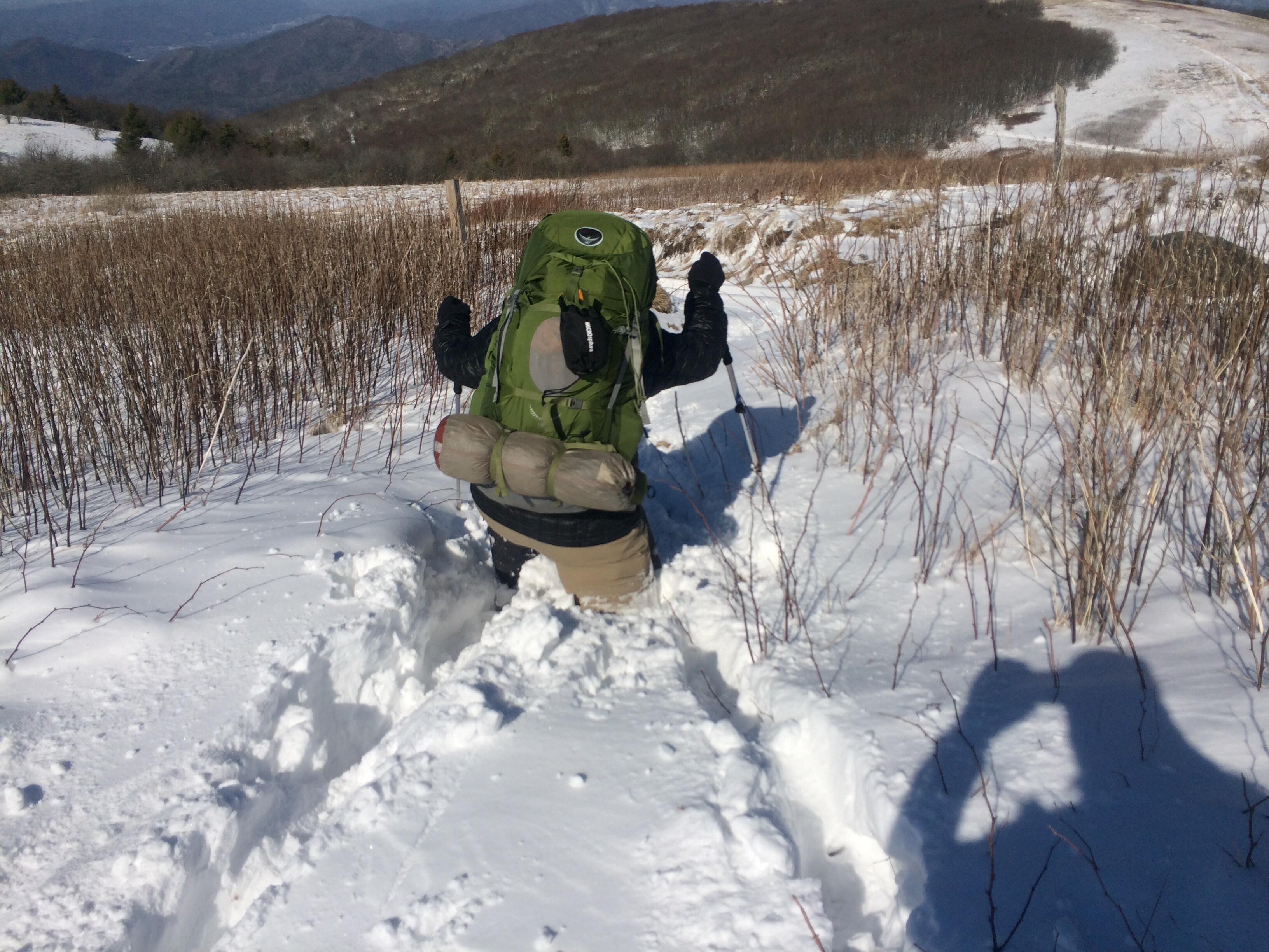 That’s another way to say it was a slow going and tiring day today. On the flip side, just like in the Smokies the snow made the mountains “pop” leading to some gorgeous views. The best of them were on top of the appropriately named “Big Bald” Mountain where we had a 360 view of the surrounding countryside. We summited that near the end of the day and I have to admit we were a little slaphappy from the hike and proud of ourselves at that point.