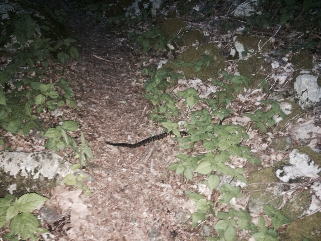 As dusk was setting I switched on my headlamp and was making good time on the trail until some ancient threat avoidance section of my brain flickered on and I found myself jumping back. It took me a second to realize that a big snake was laying across the trail. It took me a bit longer to see the rattle on the end of its tail and identify it as a timber rattler. Very glad I did not step on that dude. I backed further up and proceeded to thump the ground to get it to move. No way I was tossing anything at it or poking it with my poles! Eventually it lazily slithered off the trail and after it had gone a safe distance I passed it by. At that point I had more than enough snake encounters for the day.