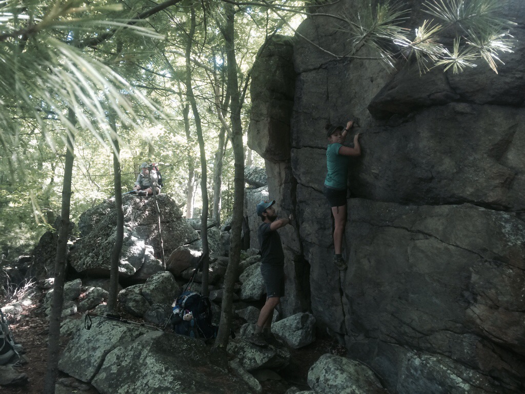 The decent down Rocky Mountain, as the name might imply, was quite rocky. On the plus side some of those rocks were boulders so we all amused ourselves climbing on them for a bit. Sunshine and Youngbeard were both experienced climbers and it was interesting seeing them attack the boulders and listen to them talk about it afterwards. Apparently in bouldering a particular rock will be referred to as a problem set and there is a specific way you are supposed to climb it. I really like how they phrased climbing as solving a problem and that term has rattled around in my head since then whenever I’ve been hopping between some of Pennsylvania’s many rocks.
